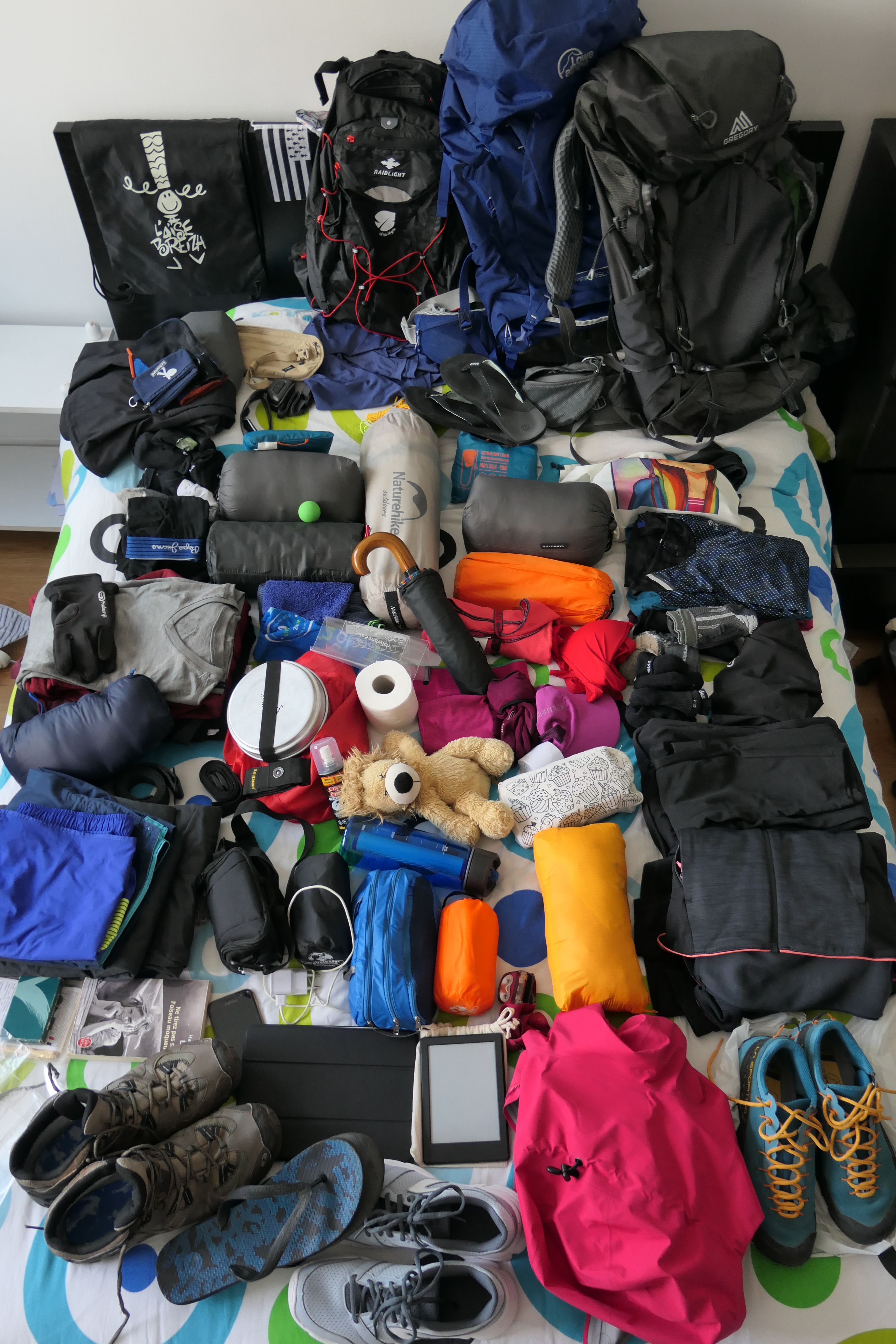 Préparer son sac est un vrai casse-tête. Il a fallu prendre suffisamment d’affaires pour s’adapter à toutes les météos et bivouaquer tout en ayant un sac le moins lourd possible pour randonner l’esprit… léger. Il faut donc être/devenir minimaliste, investir dans des affaires légères, garder l’indispensable et virer tout ce qui génère la question « et ça, on va s’en servir souvent? ».